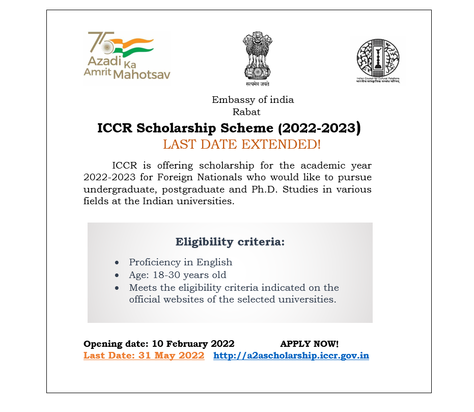 Indian Council for Cultural Relations has announced scholarships for Moroccan students to study Undergraduate, Postgraduate and PhD Courses in various fields at leading institutes in India under its Africa Scholarship Scheme for academic years 2022-23. Moroccan students between the age of 18-30 years at the time of admission in Indian Universities/Institutions and having reading, writing and comprehension skills in English language are eligible to apply. Detailed guidelines on the process of applying for ICCR scholarships online, terms & conditions of the scholarship scheme, list of institutes, important FAQs, etc. are available on the ‘Admissions to Alumni (A2A) portal - www.a2ascholarships.iccr.gov.in