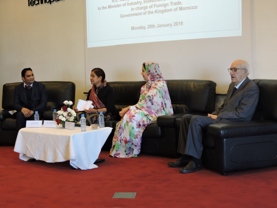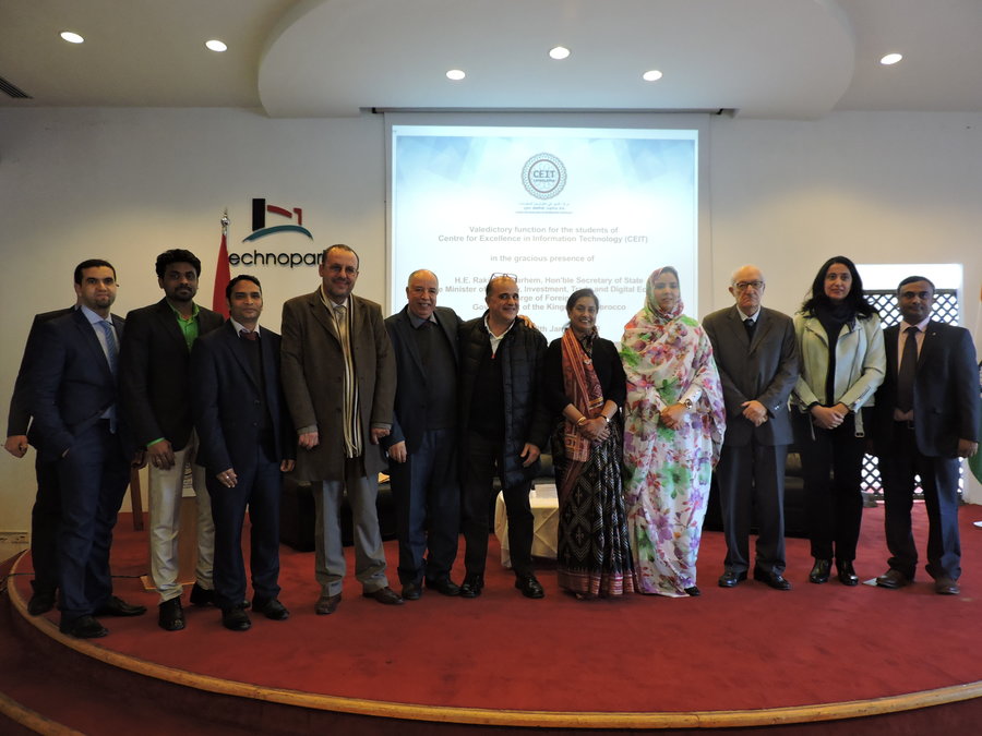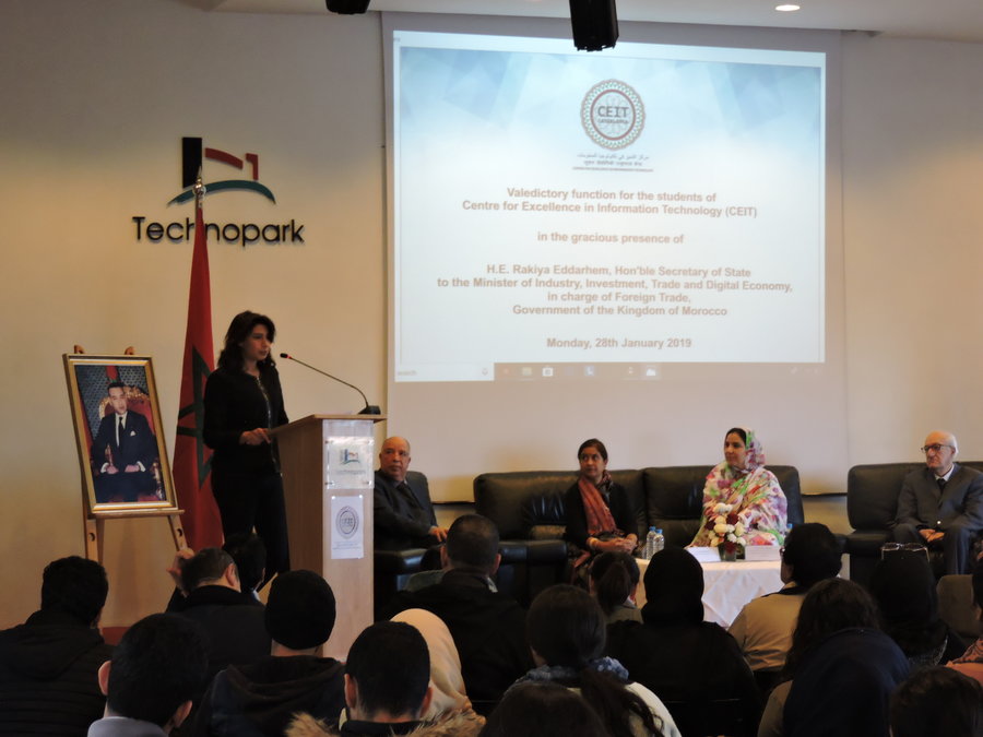 The Centre for Excellence in Information Technology (CEIT), Casablanca with the support of this Embassy and National Institute of Posts and Telecommunications (INPT), Morocco organized the Second Valedictory function at Auditorium Karim Jazouani, Technopark, Casablanca on 28 January 2019 for 75 students who recently passed their training courses from CEIT. H.E. Ms. Rakiya Eddarhem, Hon’ble Secretary of State to the Minister of Industry, Investment, Trade and Digital Economy, in charge of Foreign Trade, Government of the Kingdom of Morocco graced the occasion with her august presence and distributed certificates to the CEIT students. The event was attended by Mr. Jawad Kerdoudi, Honorary Consul General of India in Casablanca; and representatives of the Ministry of Industry, Investment, Trade & Digital Economy; National Agency for Regulation of Telecommunications (ANRT); Digital Development Agency, National Institute of Posts and Telecommunications (INPT); India-Morocco Chamber of Commerce and Industry; Technopark; Moroccan and Indian enterprises; Hassan II University Casablanca; and National Association of Asia Morocco Friendship (ANAMA)